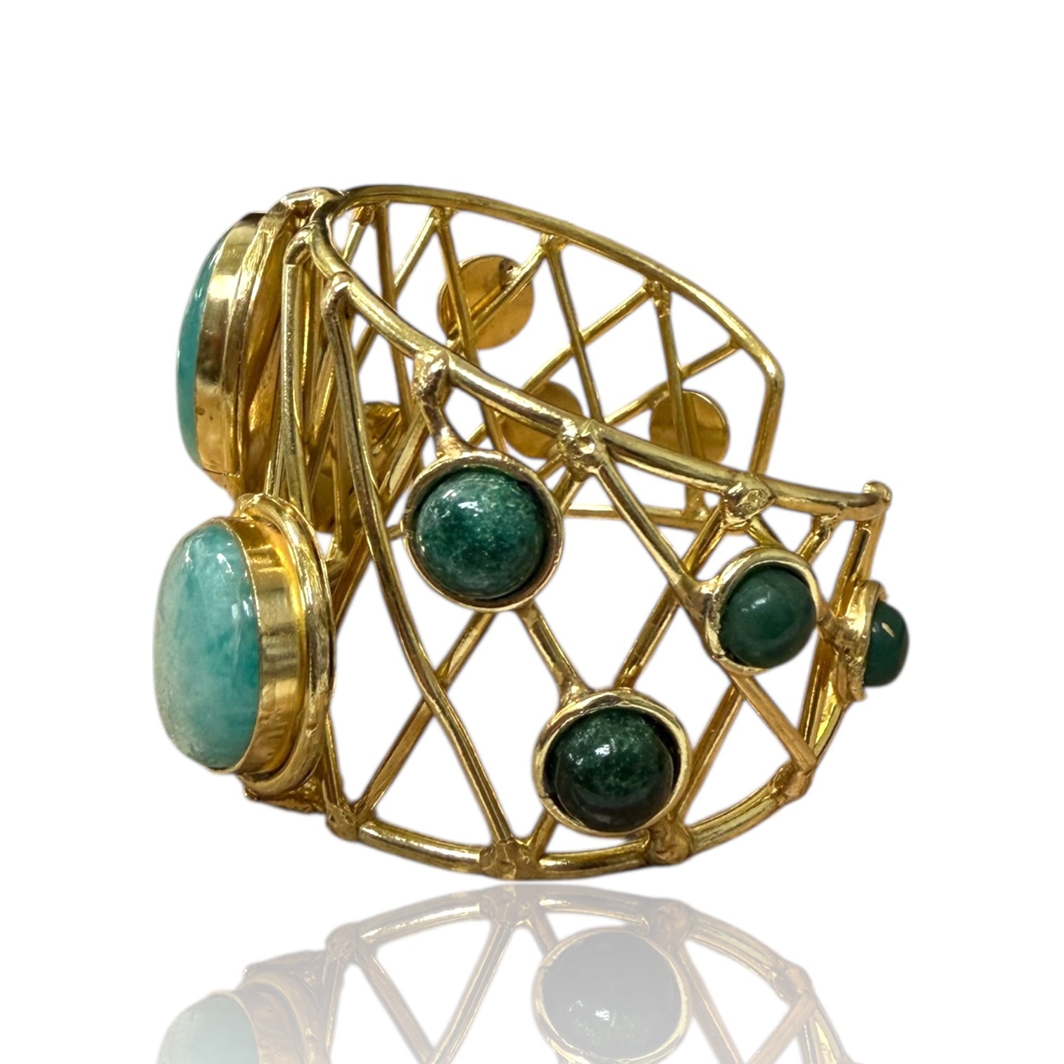 This handcrafted brass cuff showcases layered oval accents framed by an airy geometric structure. The textured gold-toned finish and sculptural form make it a striking statement accessory for modern, festive, or boho styling.