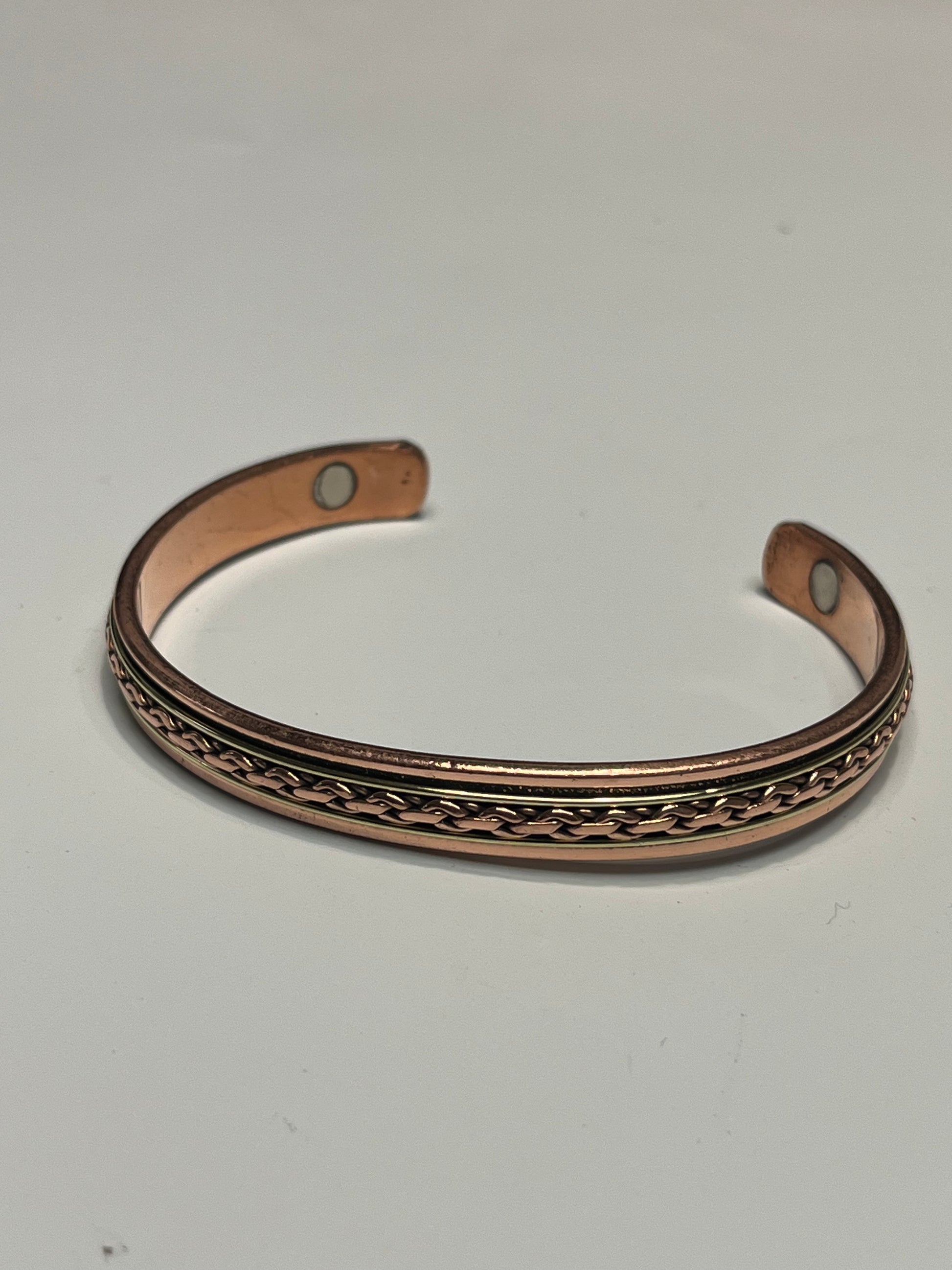 - Material: Solid copper with a handwoven texture, Discreet therapeutic magnets are embedded inside.