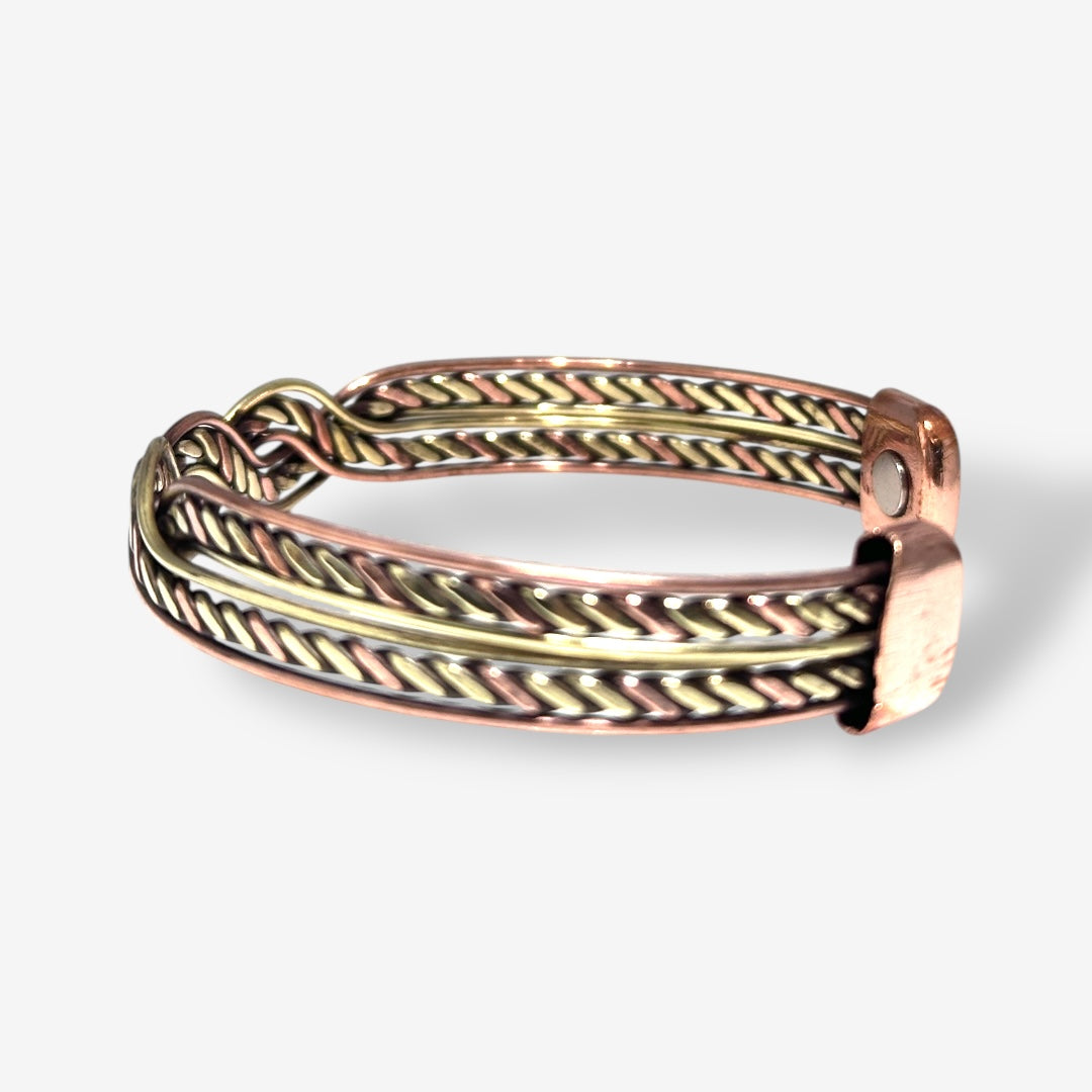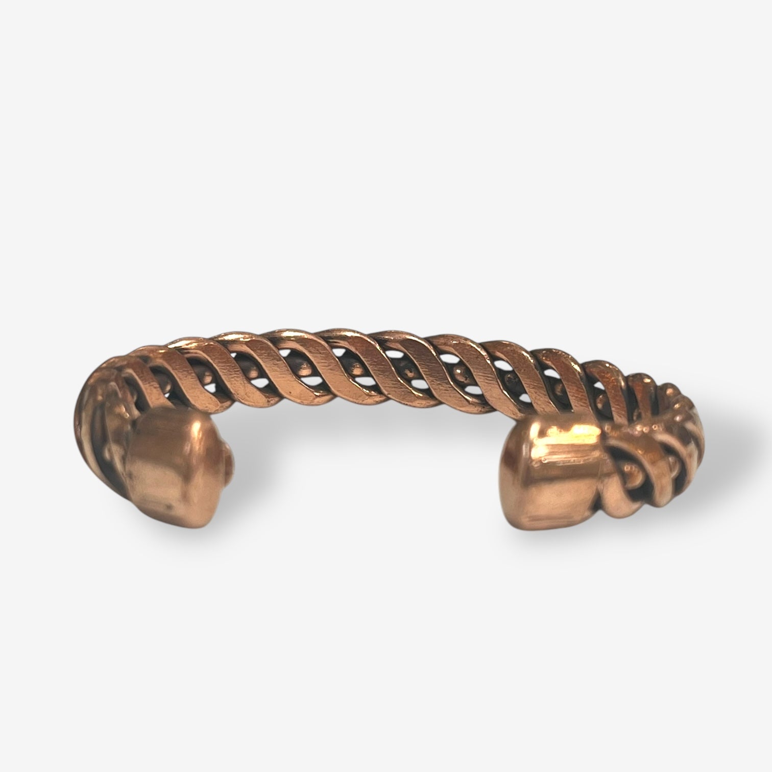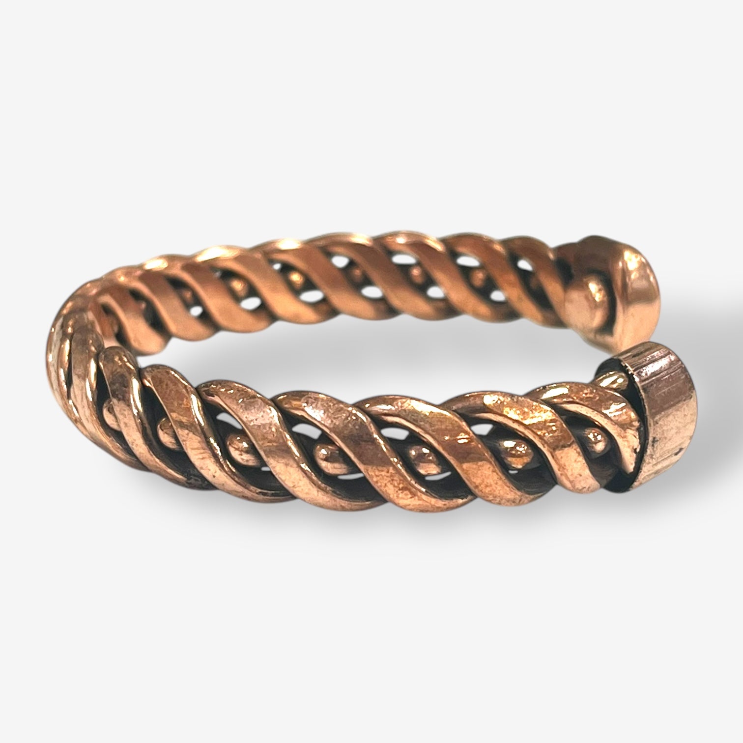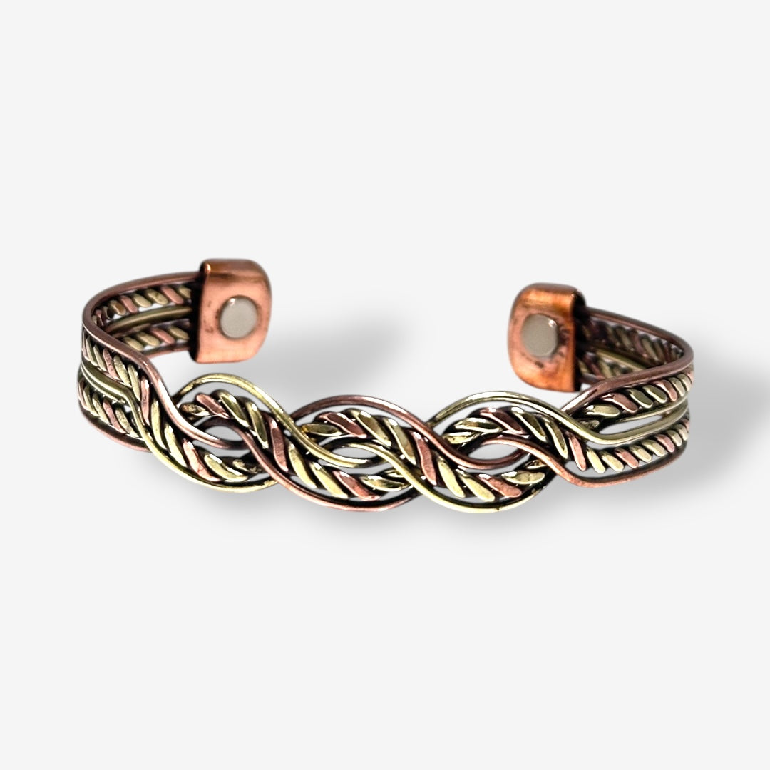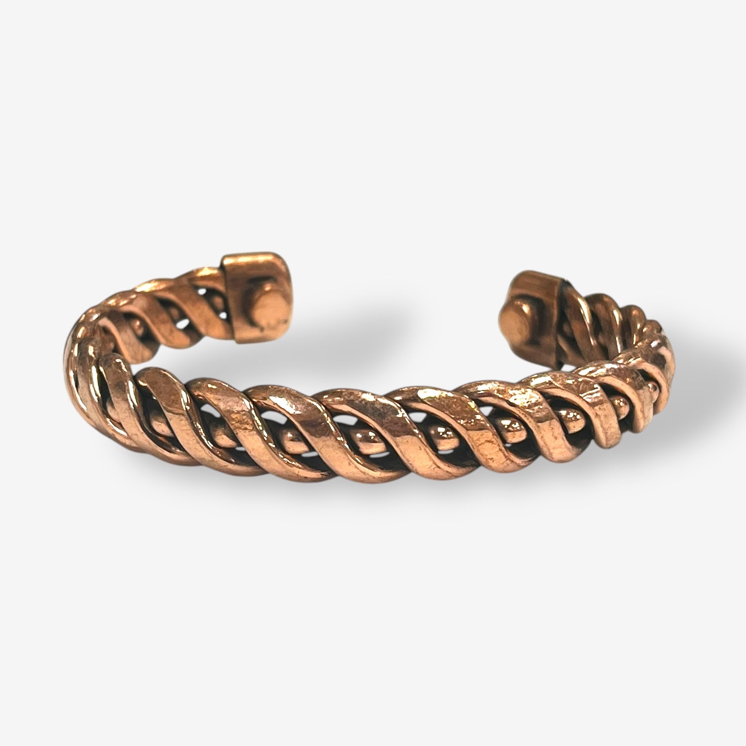 Grounded in tradition, this handwoven copper cuff blends timeless design with natural wellness. Crafted from pure copper, its textured, braided finish gives a rustic yet refined look—perfect for everyday wear or a bold accent piece. Hidden magnets on the inside are believed to promote circulation and reduce inflammation, bringing balance as well as beauty.