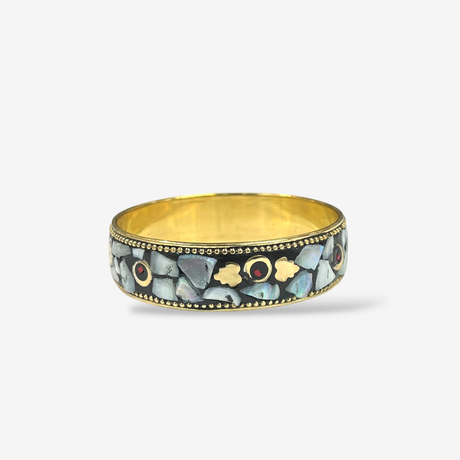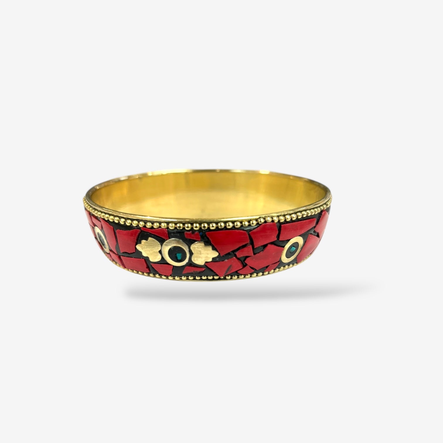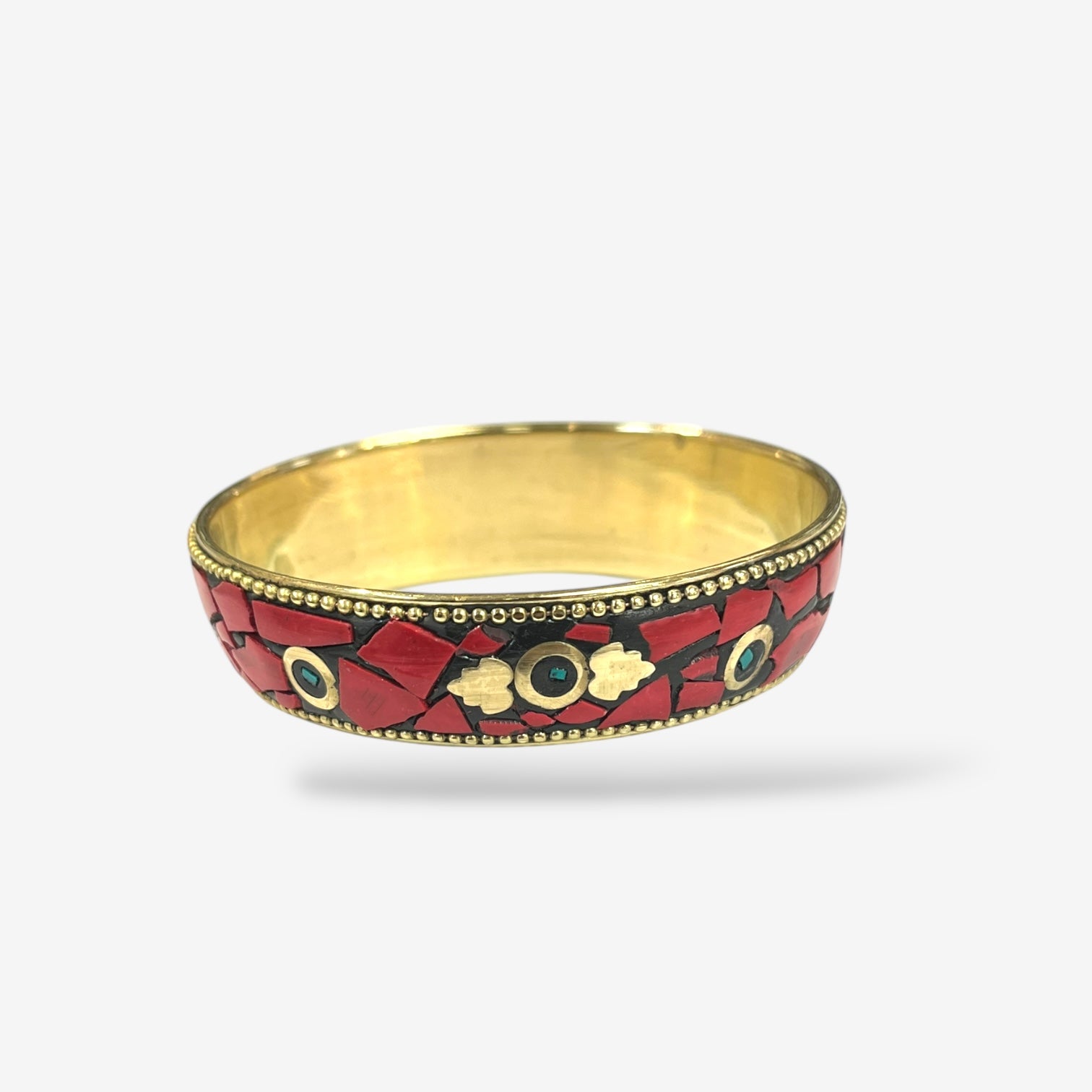 Make an unforgettable statement with the Royal Ember Bangle, a stunning fusion of intricate gold filigree and deep crimson enamel work. Its black geometric accents enhance the bold contrast, creating a piece that feels both heritage-inspired and fashion-forward.