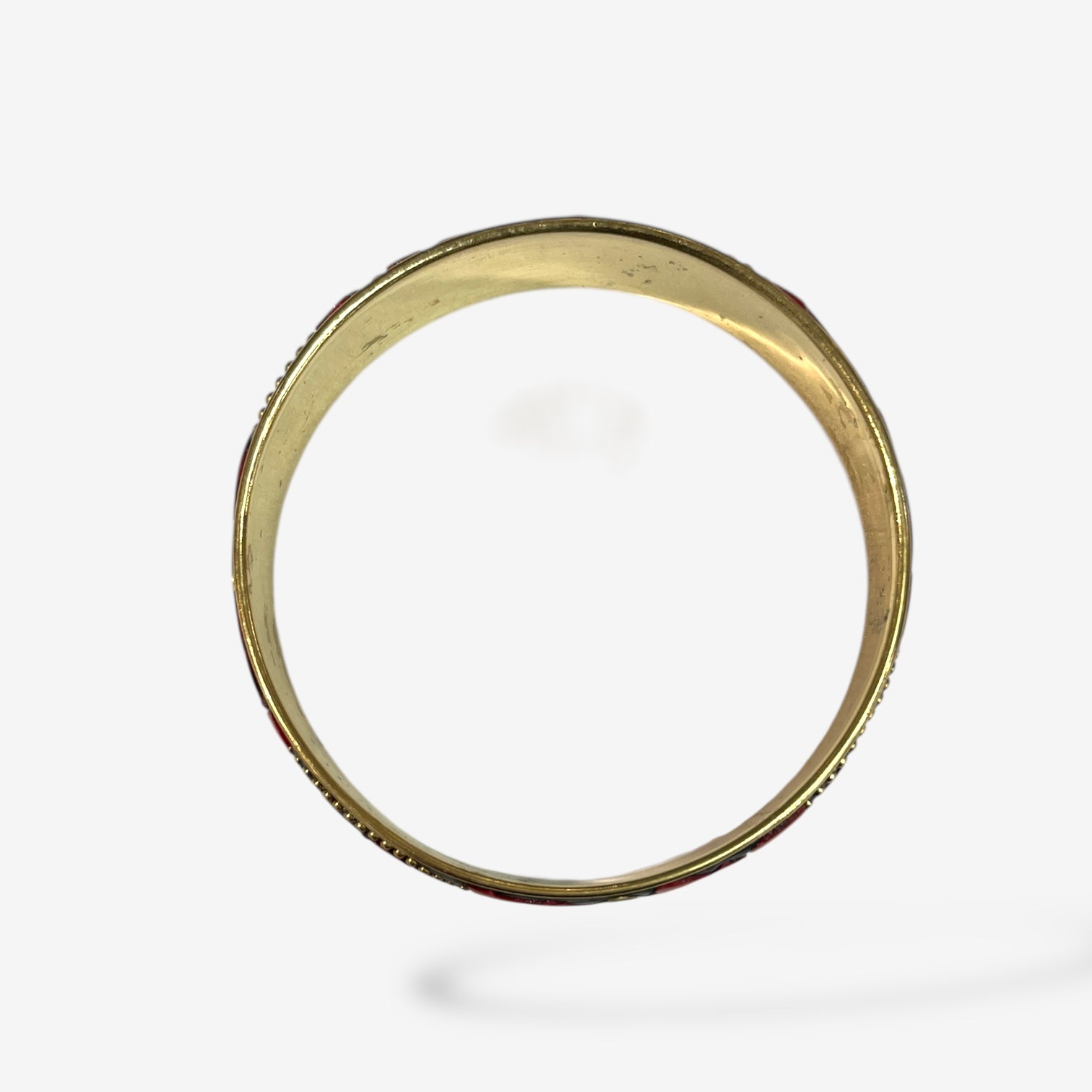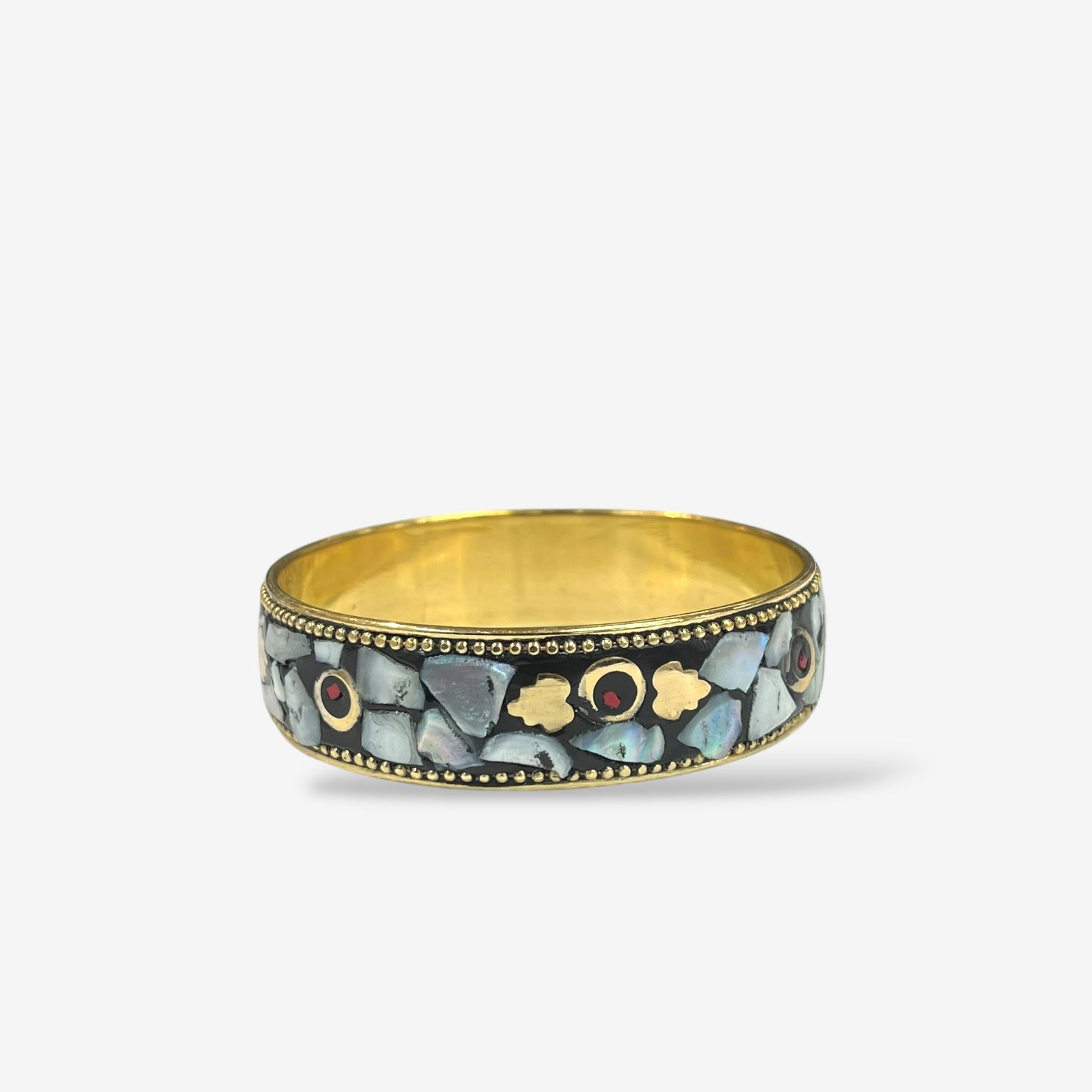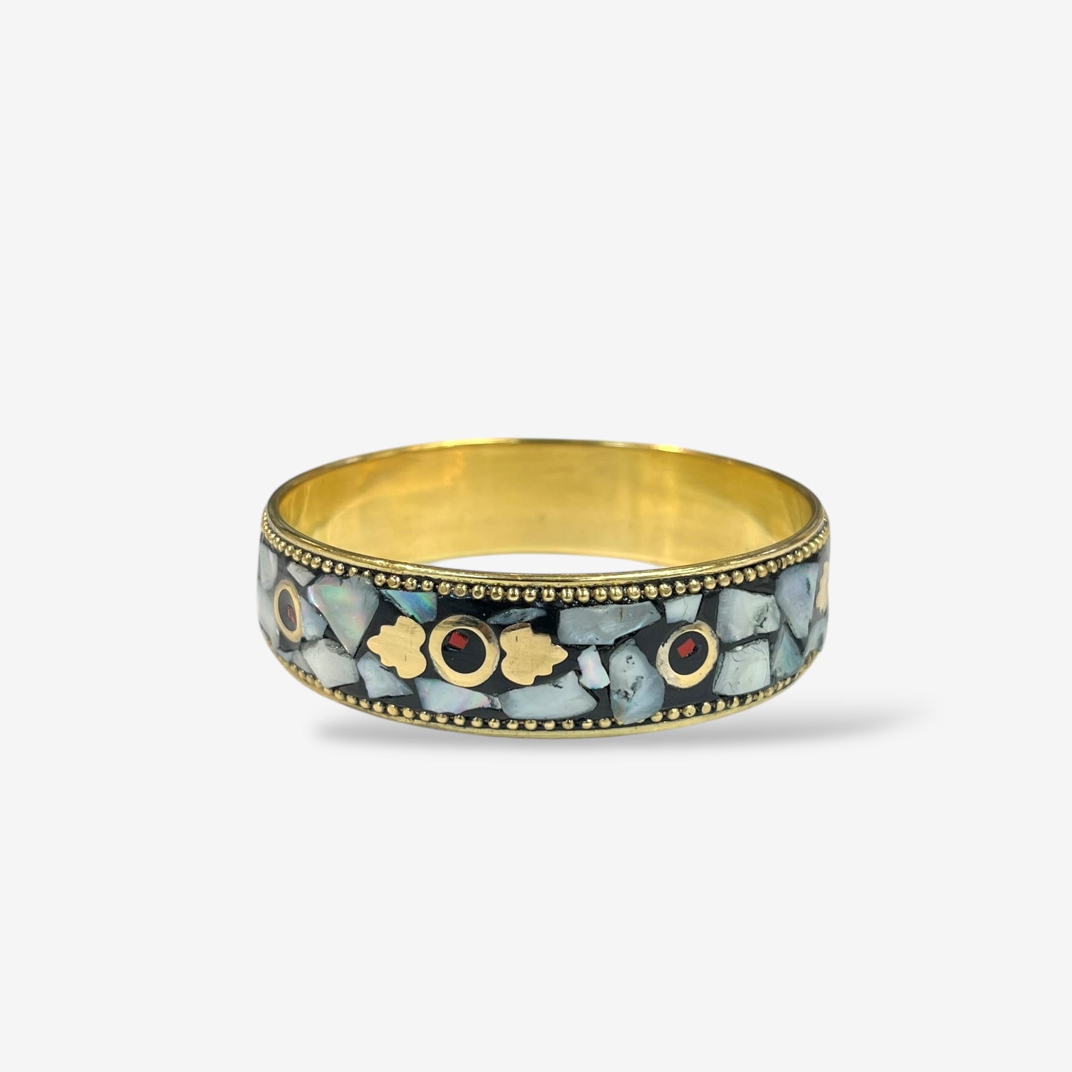 Make an unforgettable statement with the Royal Ember Bangle, a stunning fusion of intricate gold filigree and deep crimson enamel work. Its black geometric accents enhance the bold contrast, creating a piece that feels both heritage-inspired and fashion-forward.
