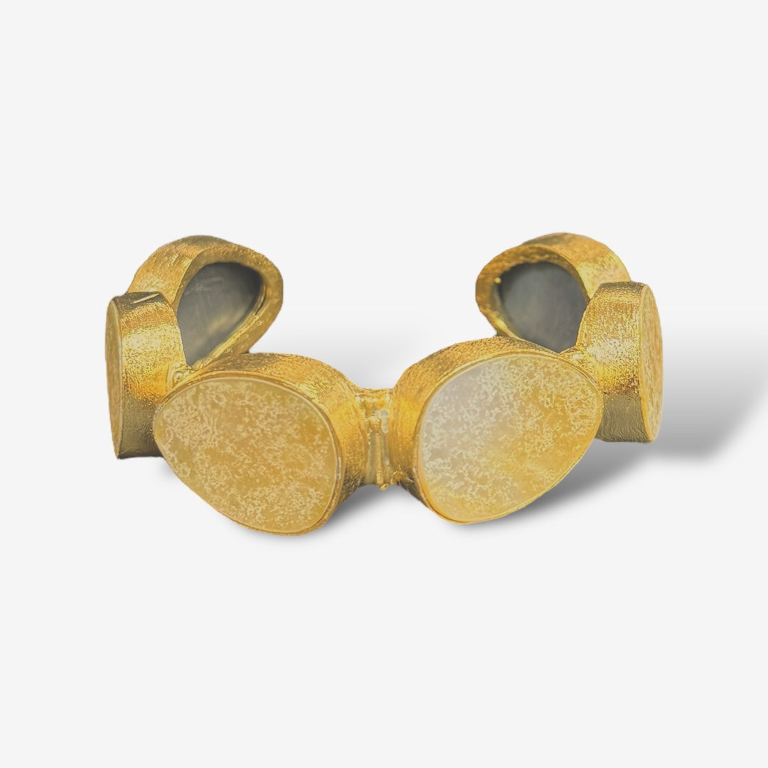 The Kara's MOP Cuff features exquisite mother of pearl stones. Crafted from brass and gold-plated materials, this cuff measures approximately 20 mm in width, making it a classic accessory.