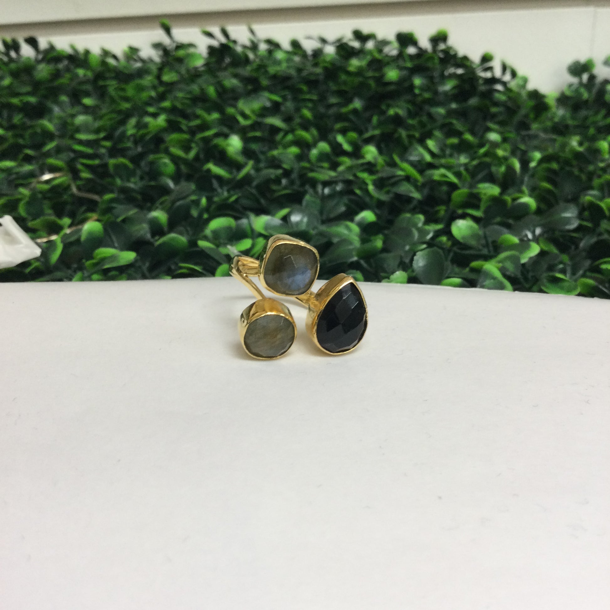 A quiet celebration of contrast and connection—this delicate ring features three natural stones in a trio of mixed shapes, thoughtfully arranged for a look that’s both playful and refined. Each stone is hand-selected and set with care, letting the natural beauty and asymmetry shine.
