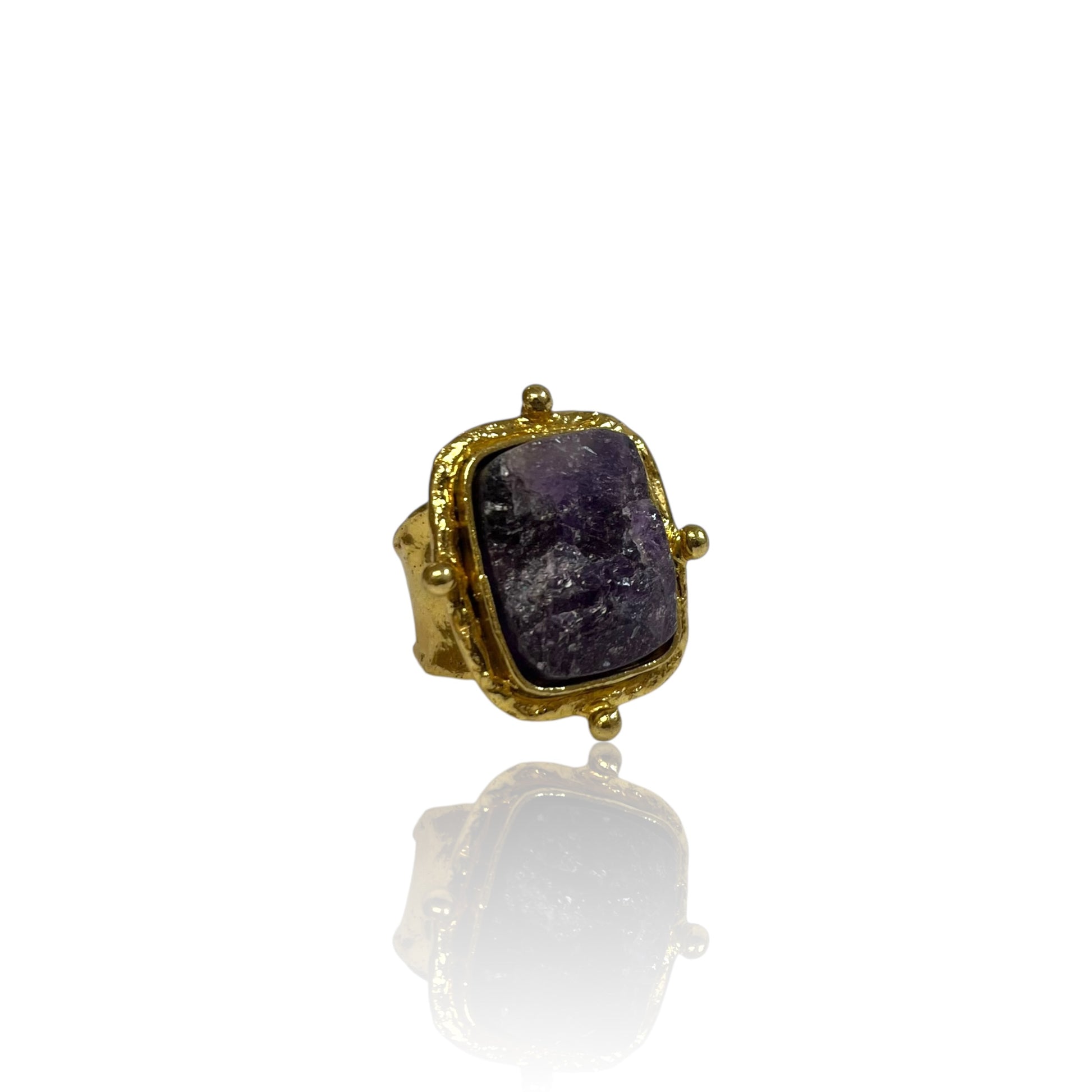 The Harper Rings feature radiant amethyst and peridot gemstones, set in brass with a gold-plated finish. Their elegant design and vibrant hues add a touch of timeless charm to any outfit.