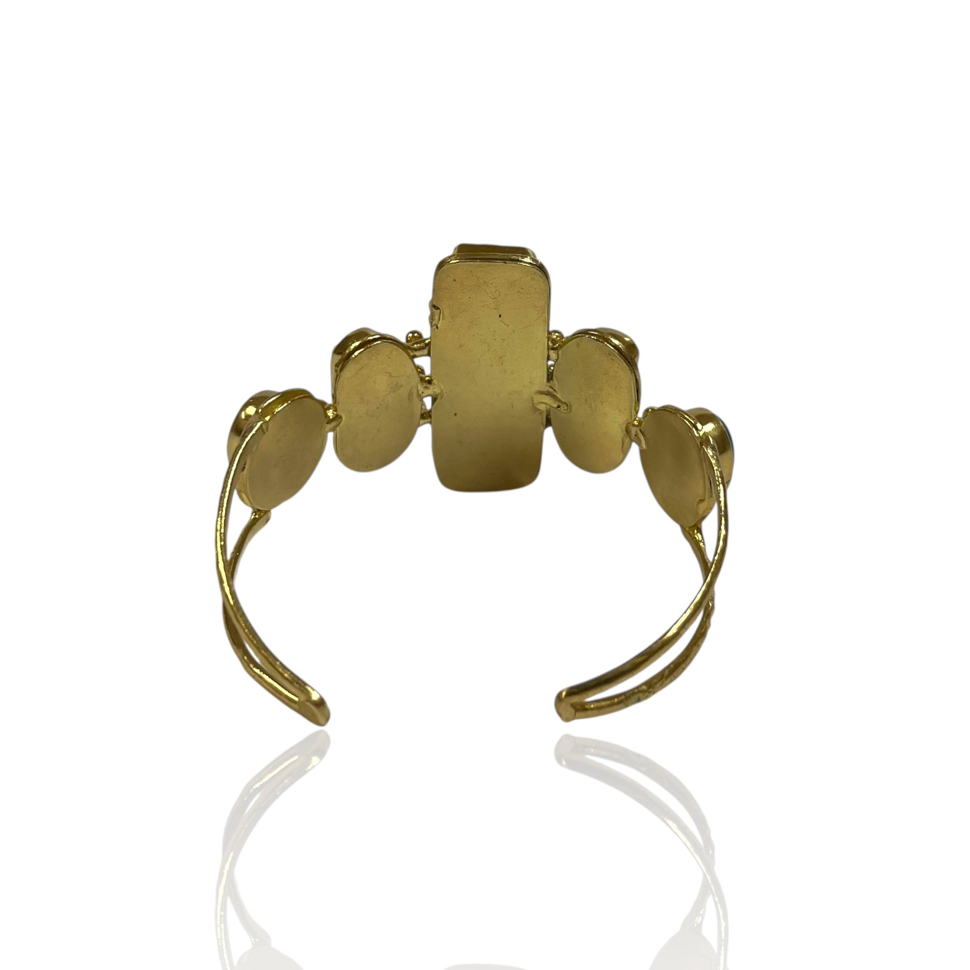 This statement cuff showcases a dramatic rectangular centrepiece paired with smooth elements, all set in a rich gold-tone finish. Designed for those who love distinctive, artisanal jewellery with a modern yet timeless appeal.