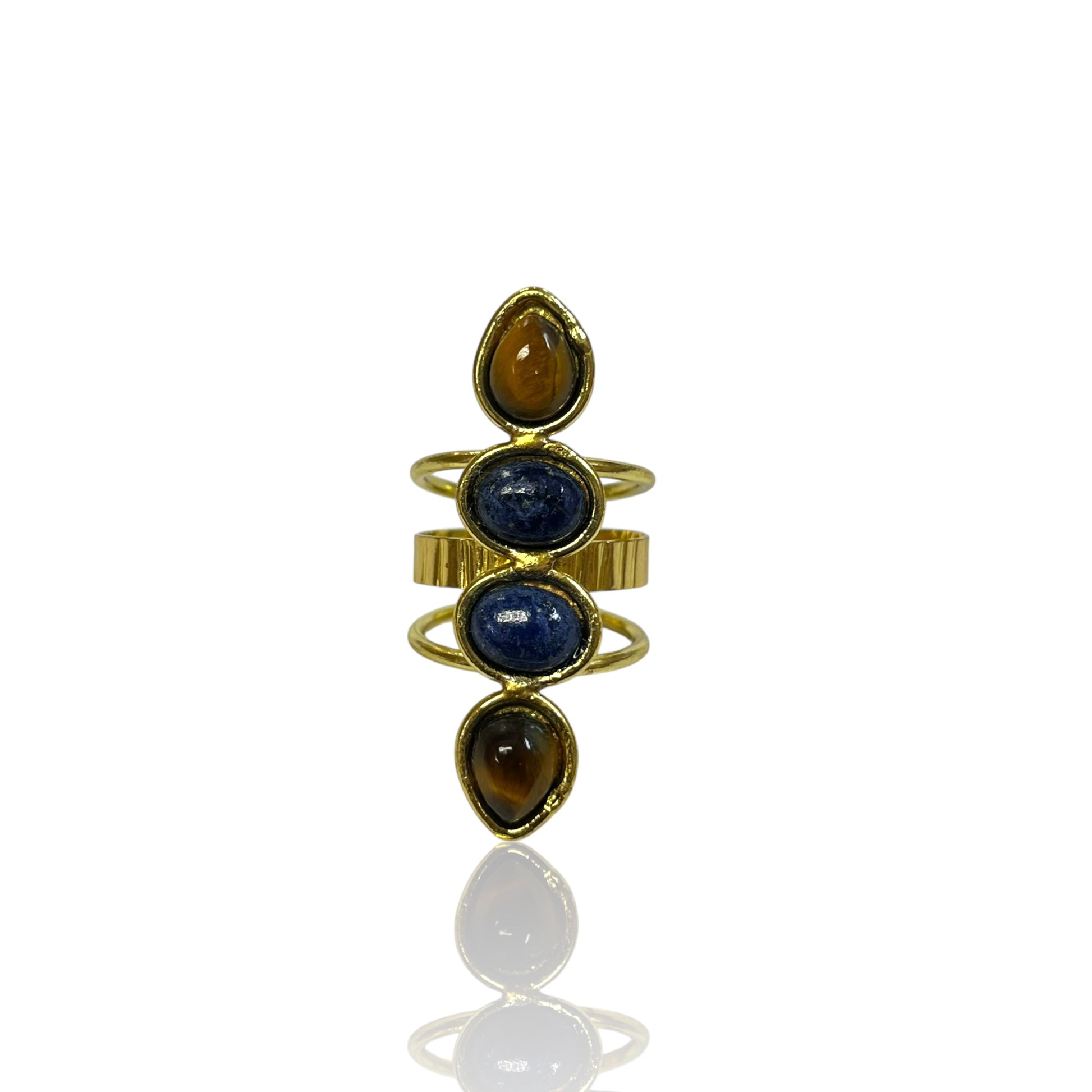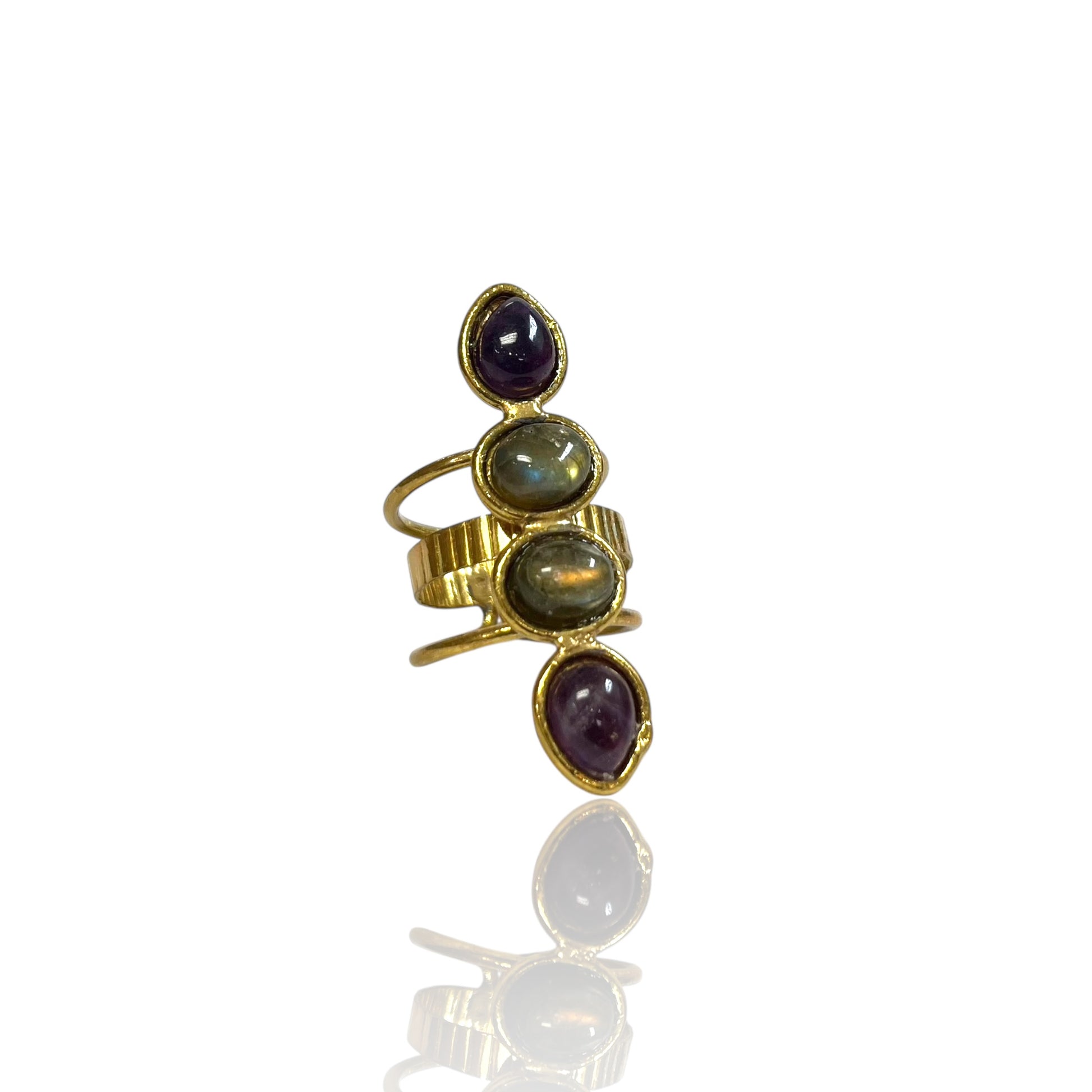 The Luna Ring showcases Amazonite, Labradorite, Lapis Lazuli, Tiger's Eye, Moonstone, Black Onyx, and Amethyst, set in gold-plated brass for a celestial and elegant look.