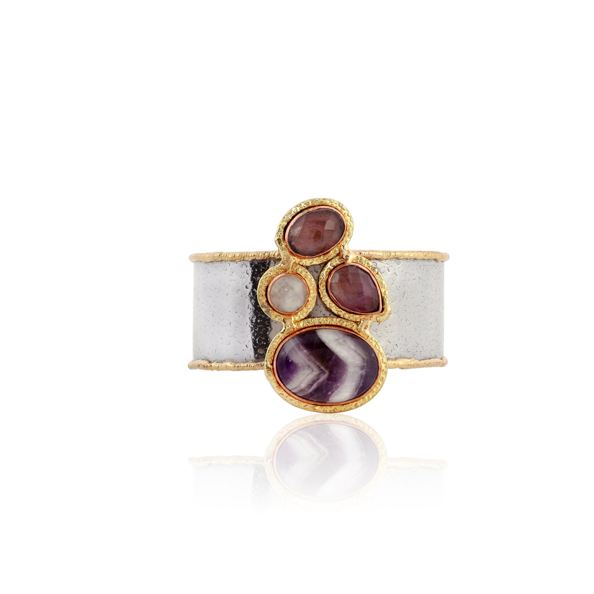 A bold statement piece, this wide hammered brass cuff features a striking cluster of natural stones. Rich amethyst tones are beautifully contrasted with a luminous pearl, creating a modern yet organic look.