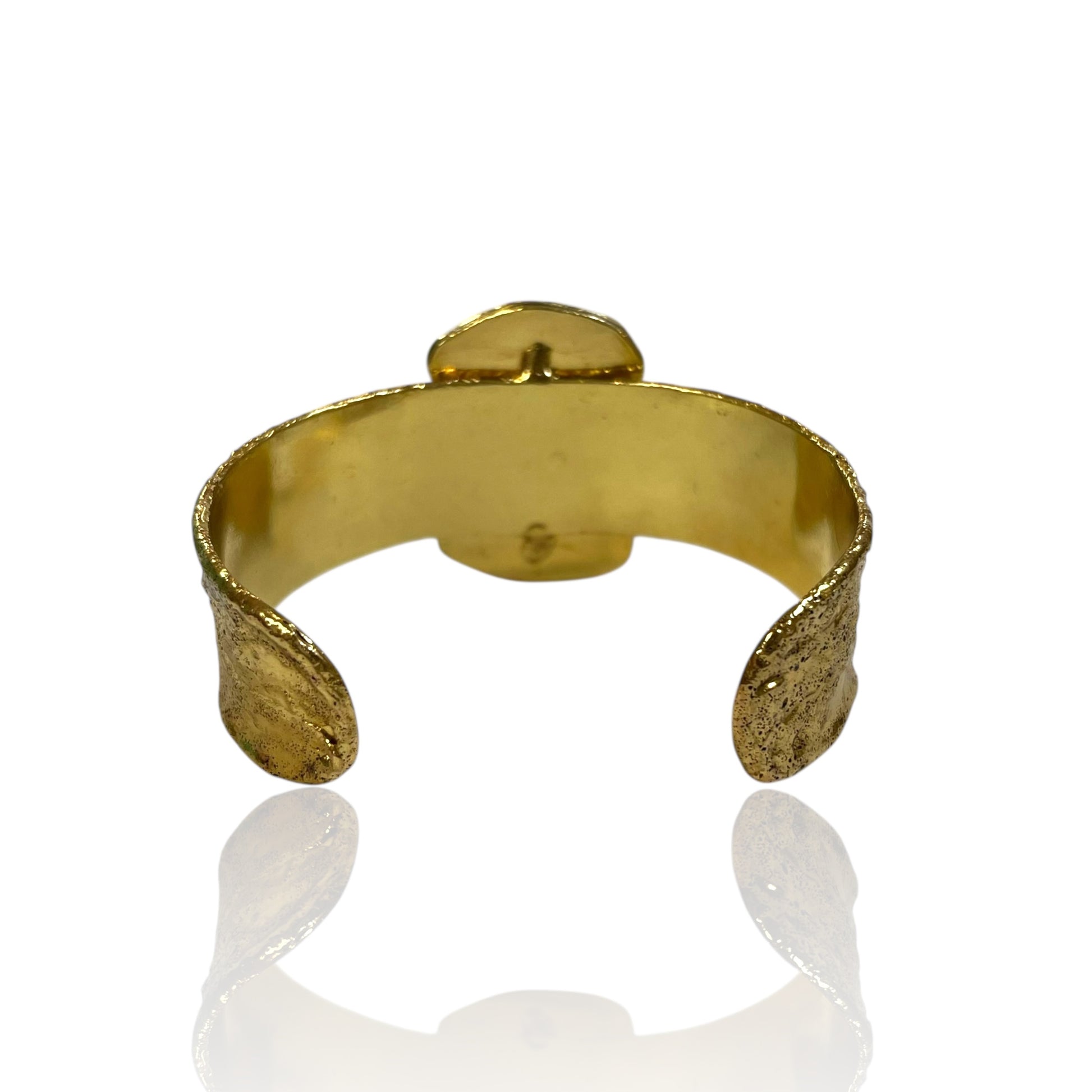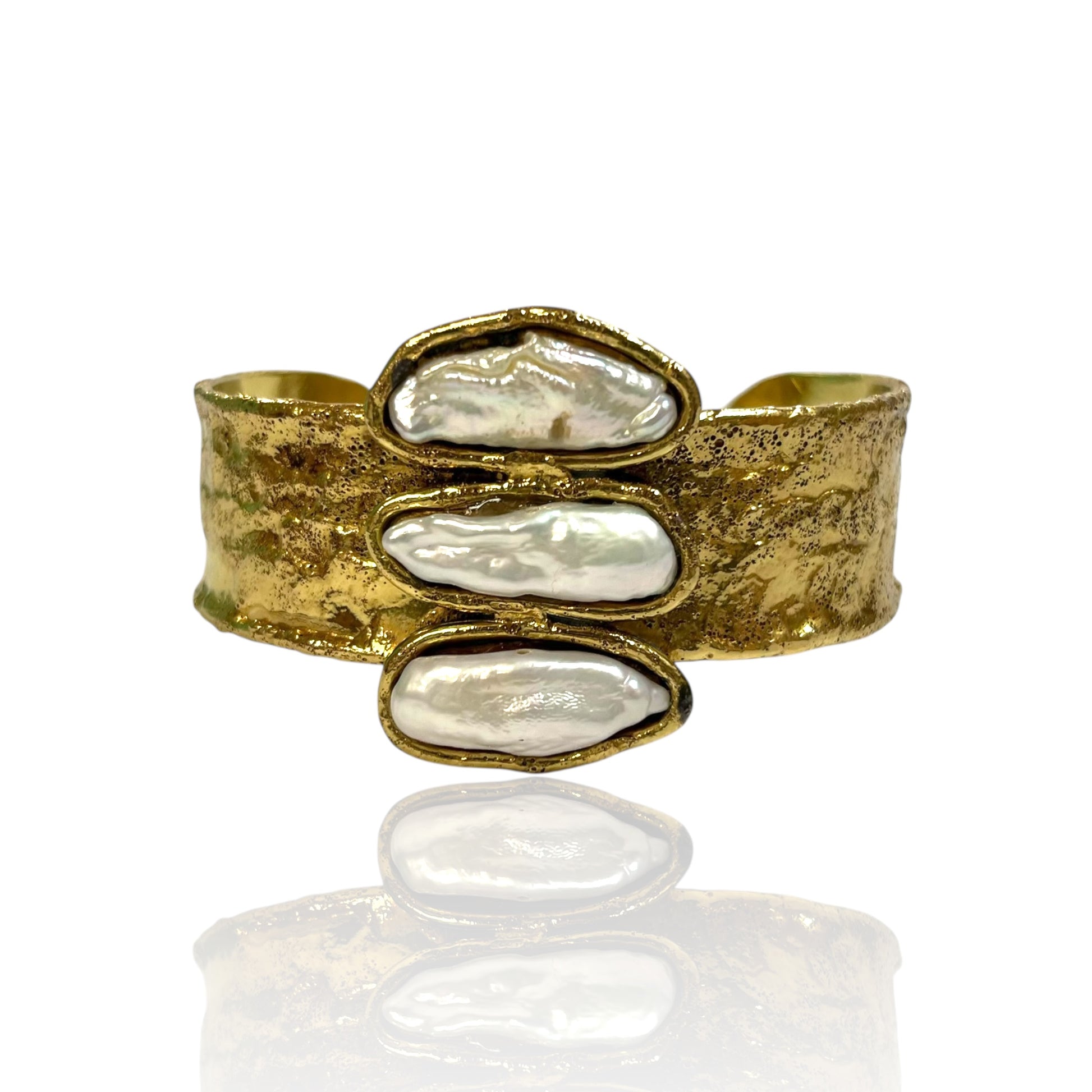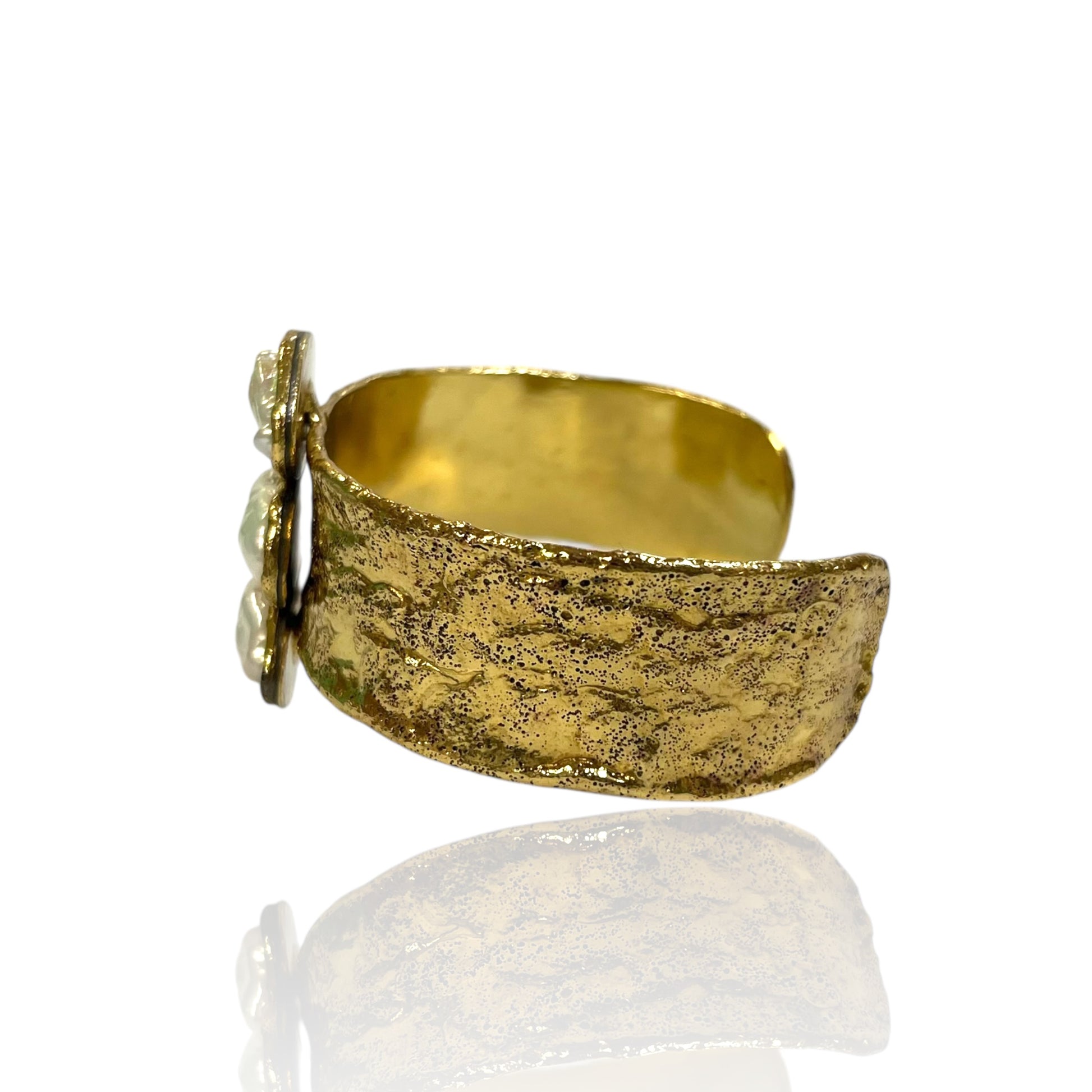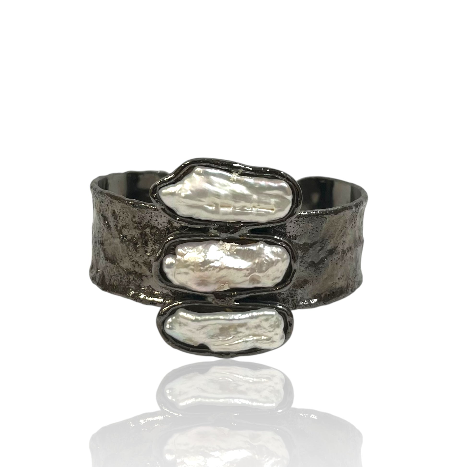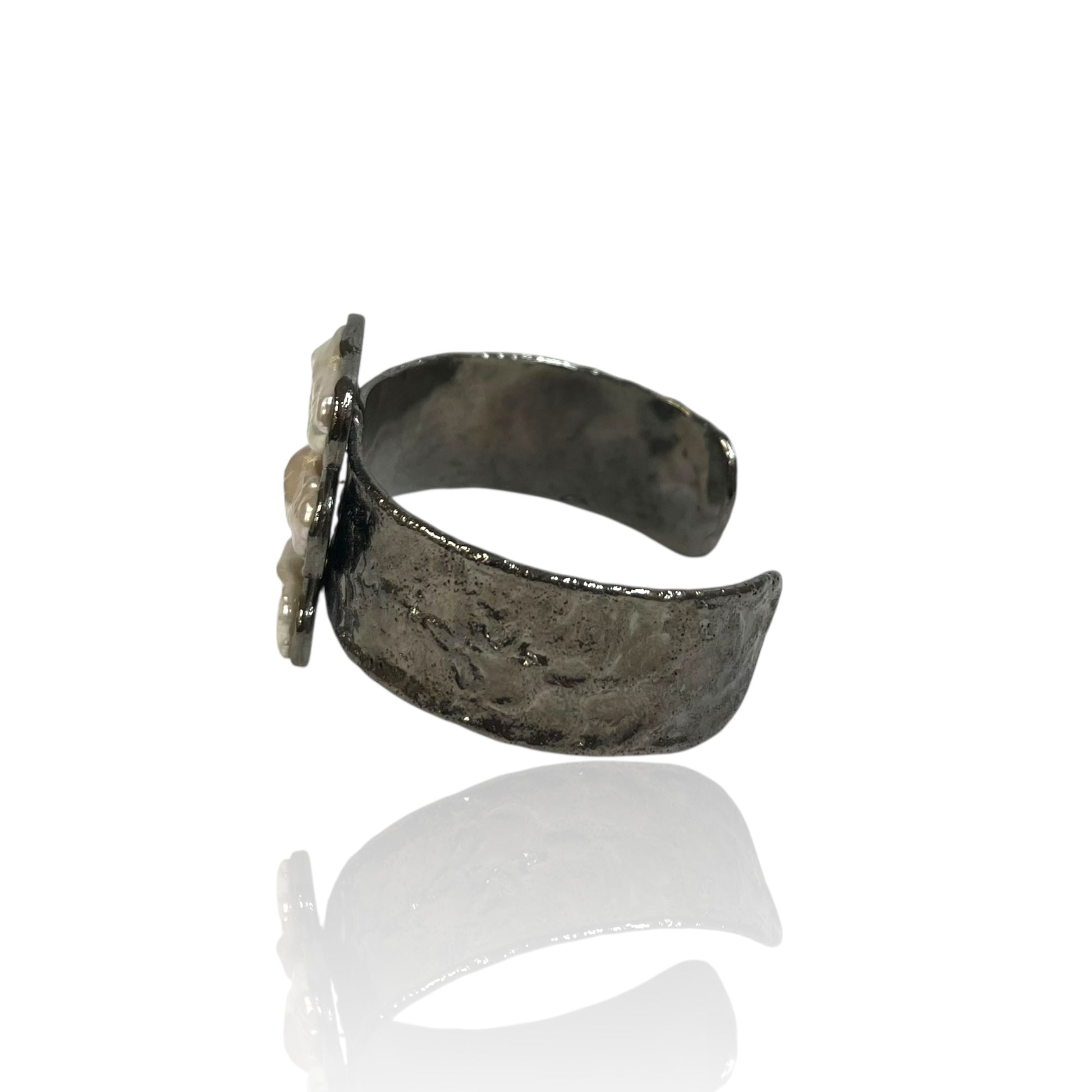 The rugged surface of the metal contrasts beautifully with the smooth iridescence of the pearls, giving the piece both strength and elegance.