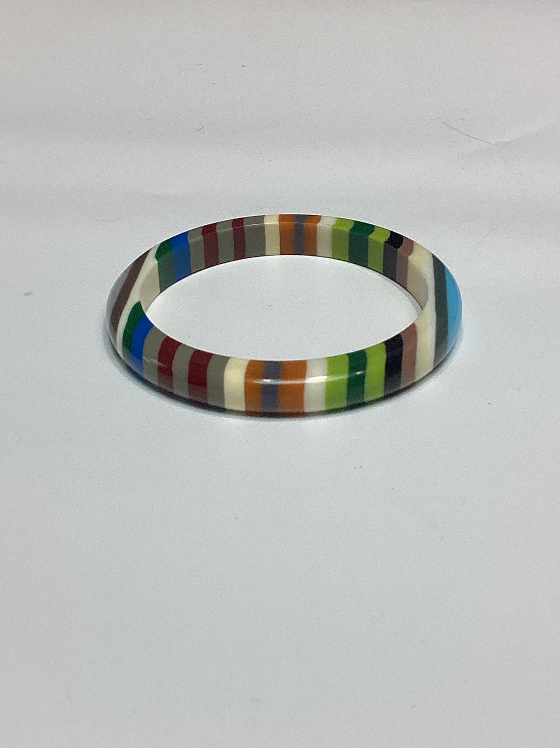 The Rainbow Resin bangle with colorful rainbow stripes. These eye-catching bangles are perfect for adding a touch of fun and personality to any outfit.