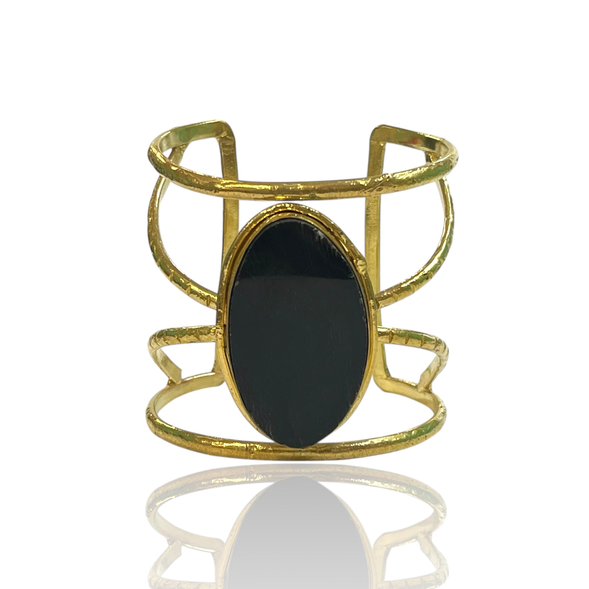 Modern and bold, this wide brass cuff showcases an open-frame design with a striking natural stone at its center. The textured finish adds depth, while the stone becomes the focal point, giving each piece its own unique character.